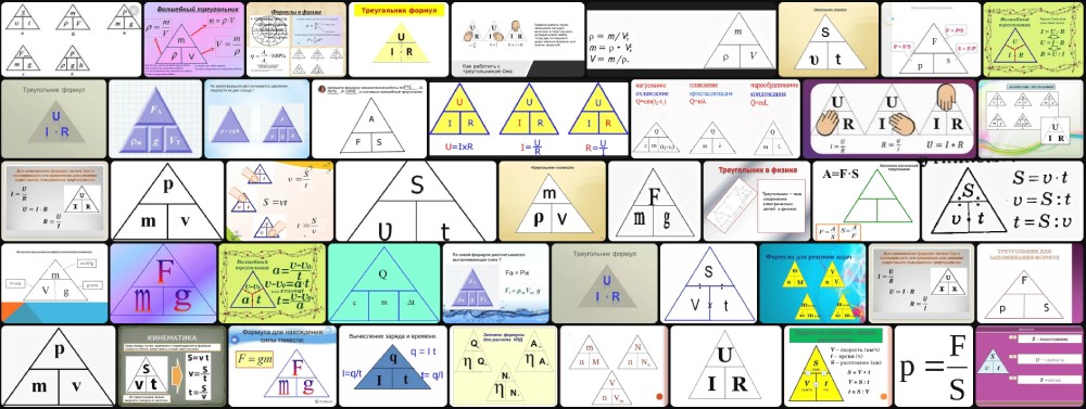 The most glaring, illustrative and funny example of the inability to work with equalities and equations, when memorization is prioritized over understanding, is the so-called “magic triangles of formulas” for “simple” memorization of formulas in physics and even mathematics!