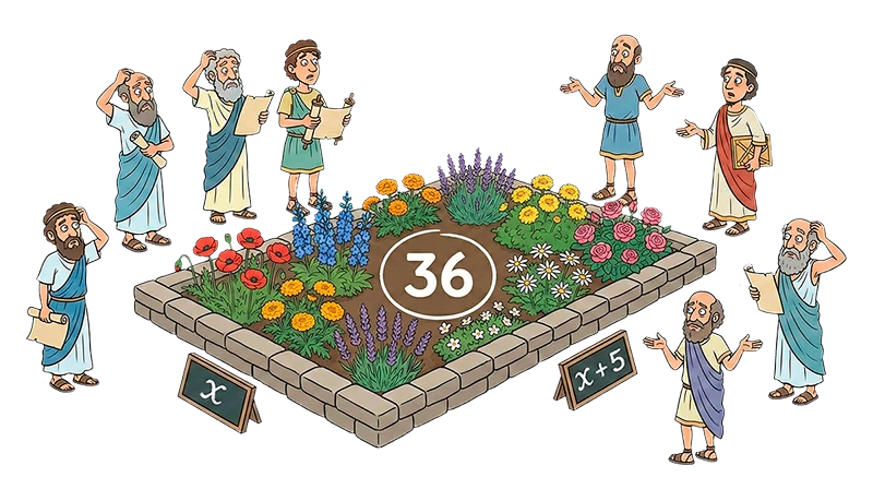 An ancient Greek king (they were called basileis) ordered a luxurious garden to be built with an area of 36 square meters. Also, one of its sides must be 5 meters longer than the other. What should be the length and width of the garden?